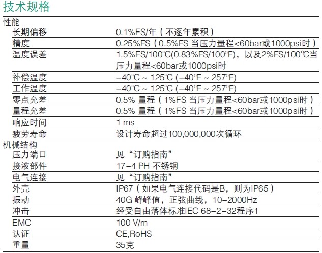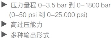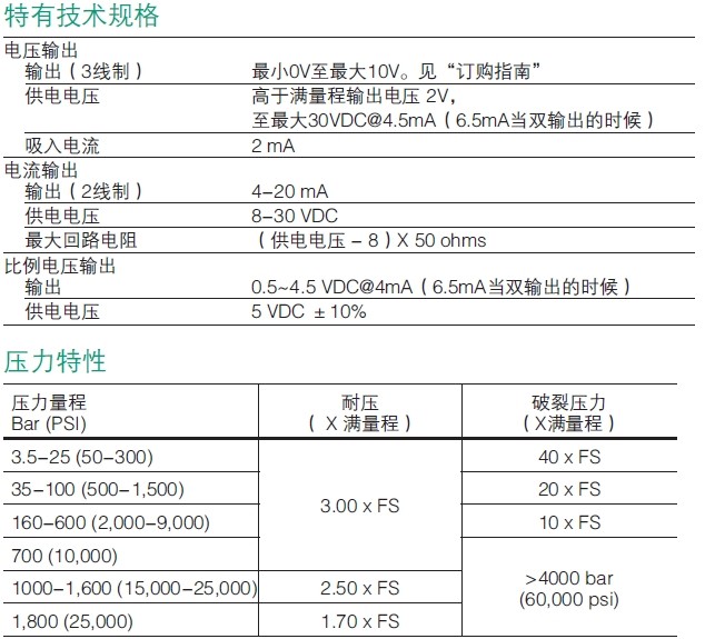 注意:1.溫度輸出功能只能用于電壓輸出模式。電氣接頭必須具有4個針腳,精度為3.5%溫度量程范圍。額外消耗2mA供電電流。2.1000bar以及以上量程只能配2T的壓力接口。3.壓力范圍用于上拉或者下拉電阻負(fù)載,請與我們聯(lián)系。4.壓力范圍700bar以及以上量程的傳感器必須配有壓力阻尼。